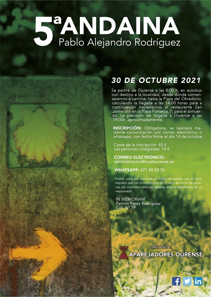 Como viene siendo habitual en los últimos años, el Colegio organiza un paseo-andaina en recuerdo de todos los compañeros fallecidos y en especial, los que nos han dejado a lo largo de este año 2021.
